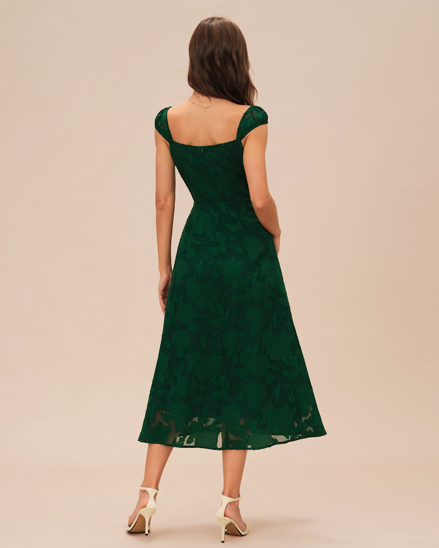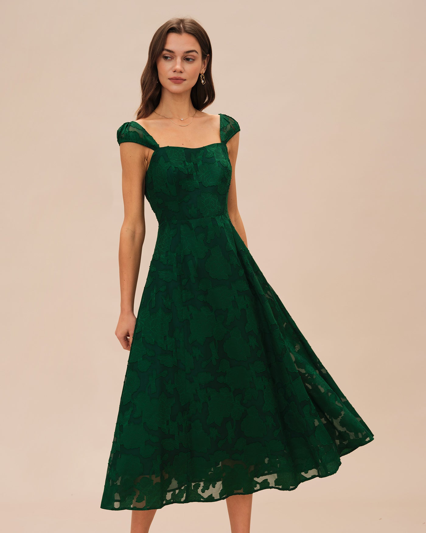 Green Jacquard Cap Sleeve Midi Dress