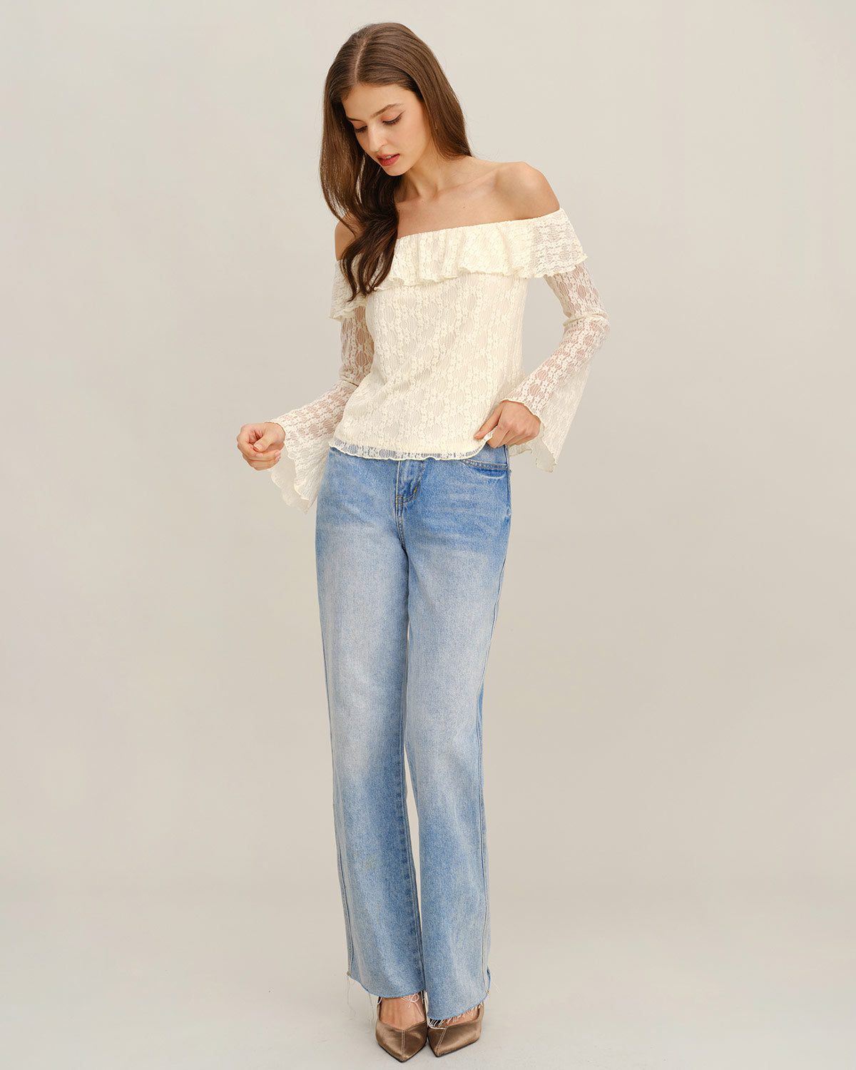 Aprikosenfarbenes schulterfreies Spitzen-T-Shirt