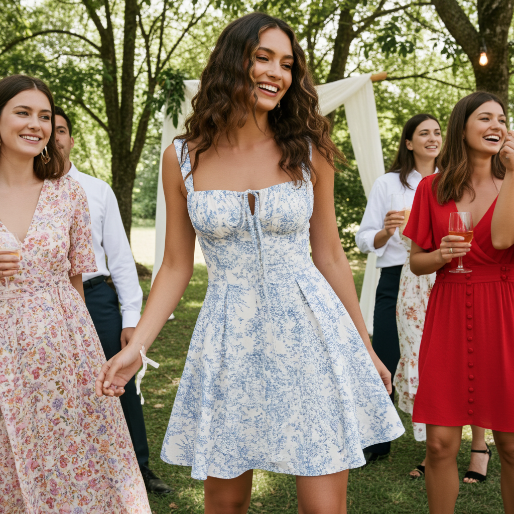 Dieses Kleid mit zartem, blauem Blumenmuster besticht durch sein gerüschtes Design, das die figurbetonte Passform betont. Die verstellbaren Träger und der Slip-Stil bieten Komfort und Bequemlichkeit, während der leichte Stoff für Atmungsaktivität sorgt.