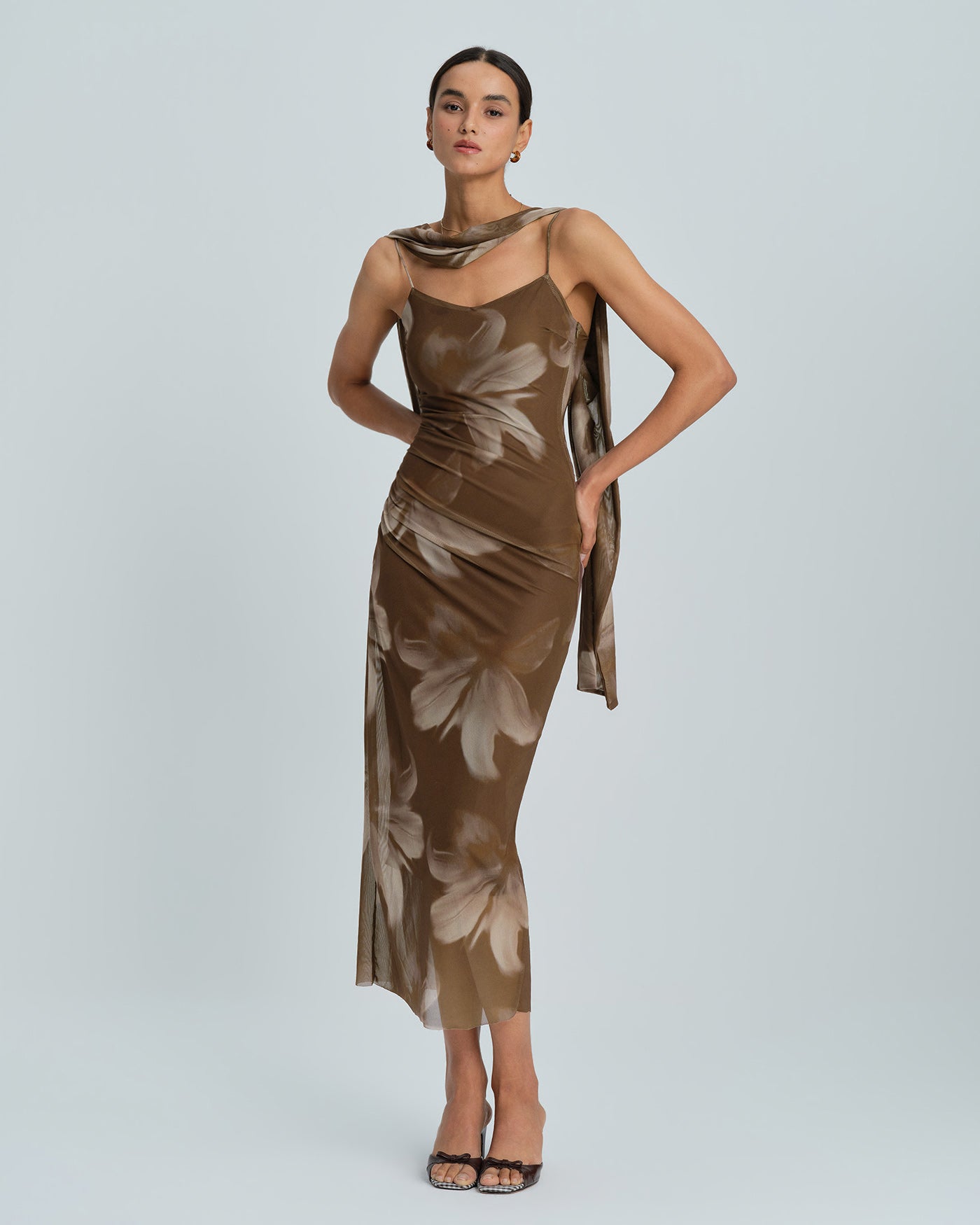 Brown Floral Sleeveless Midi Dress