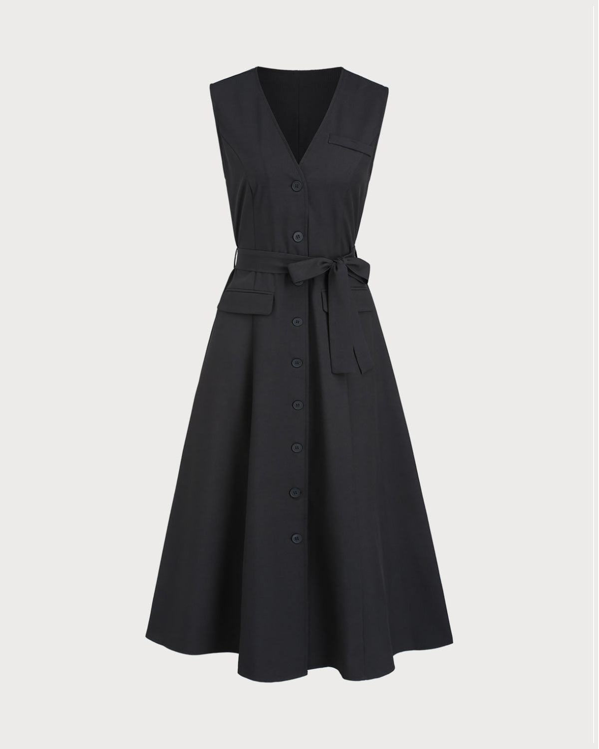 Black V Neck Belted Sleeveless Midi Dress
