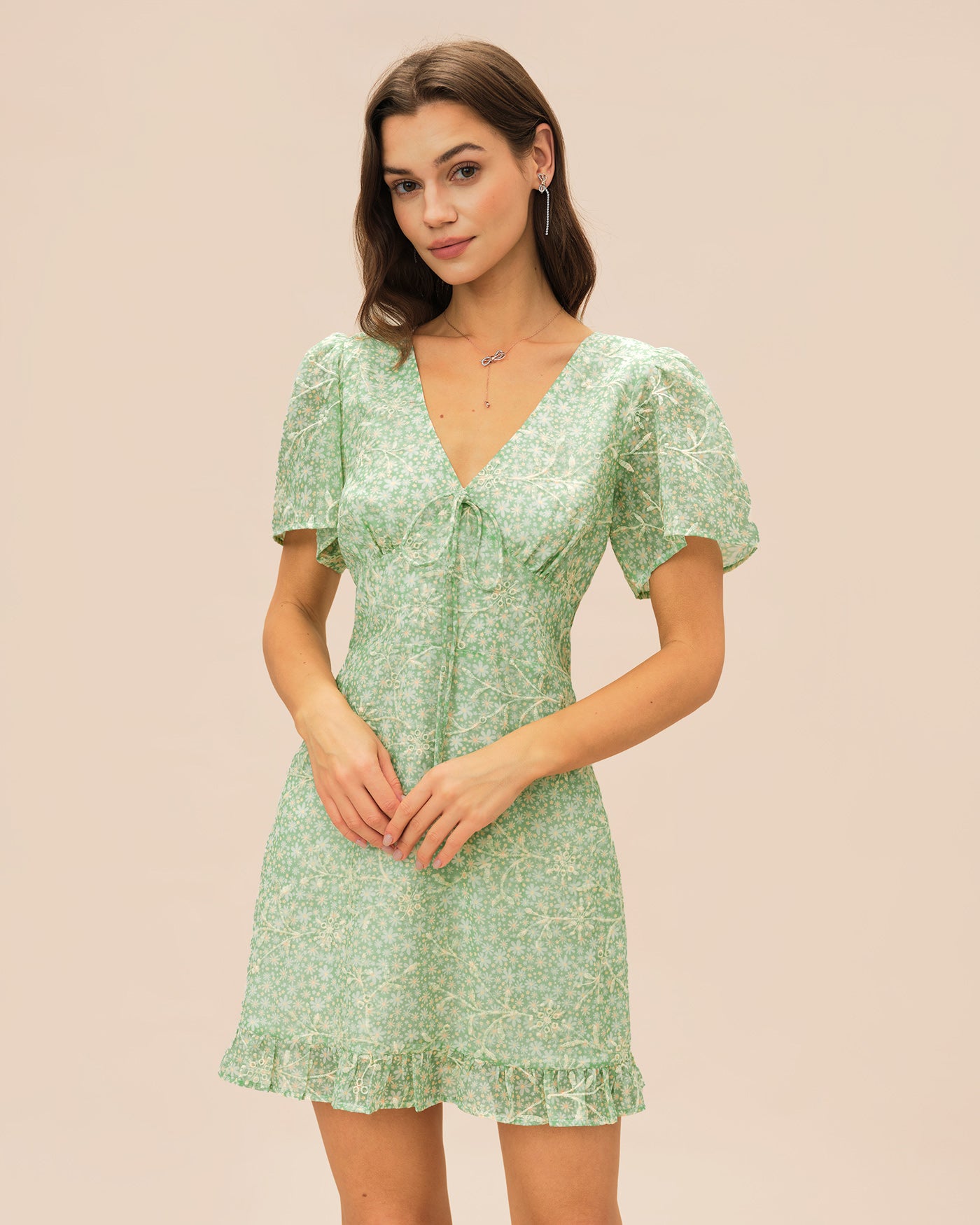 Green V Neck Floral Mini Dress