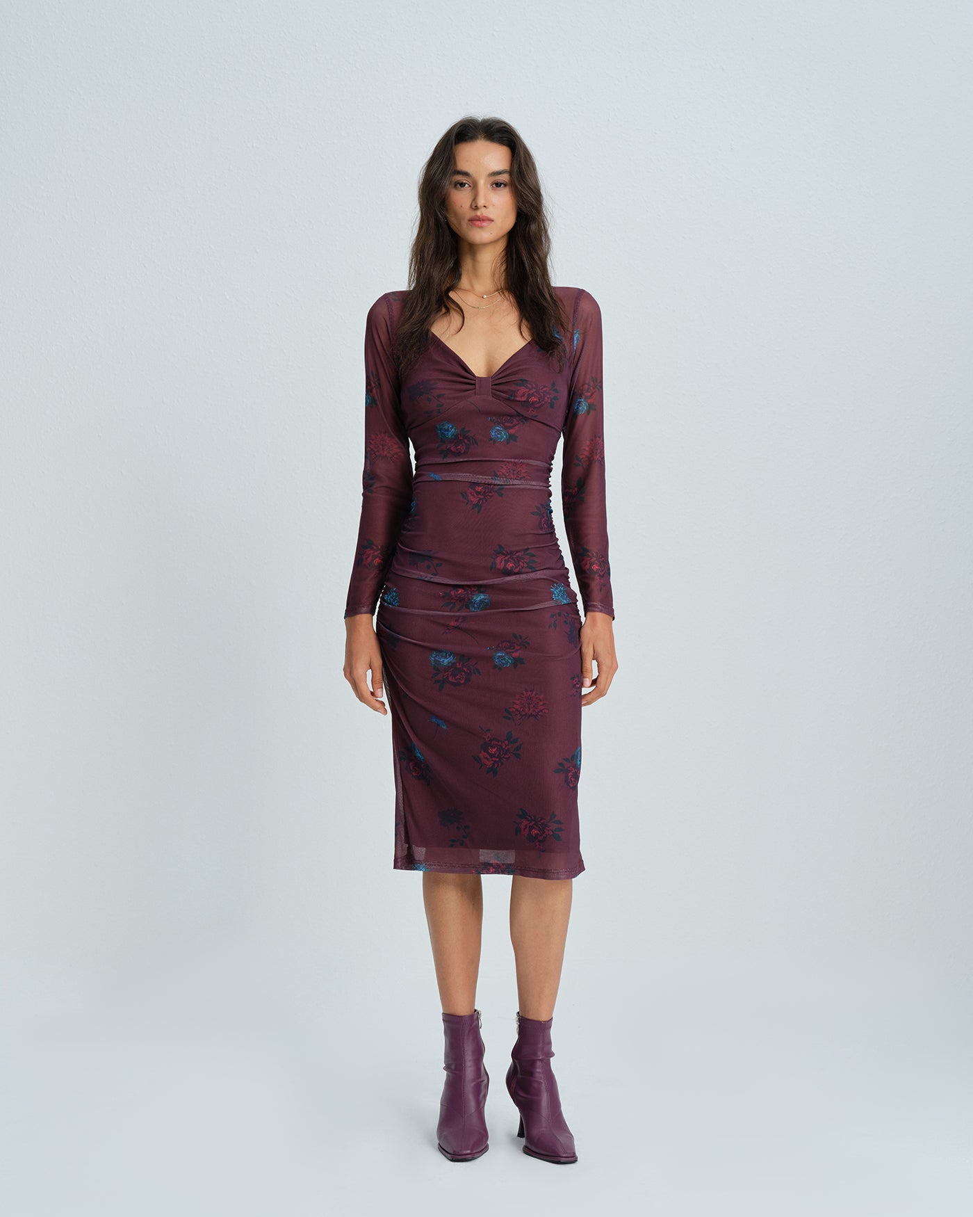 Purple V Neck Floral Midi Dress