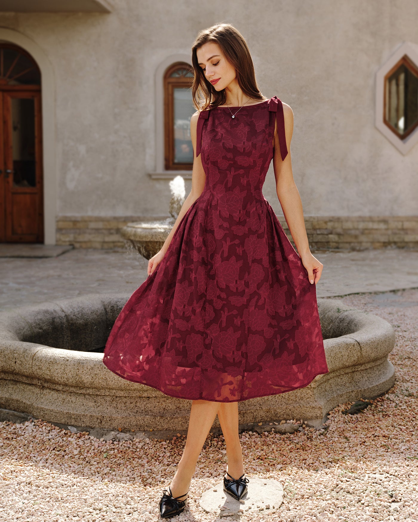 Red Jacquard Chiffon Midi Dress