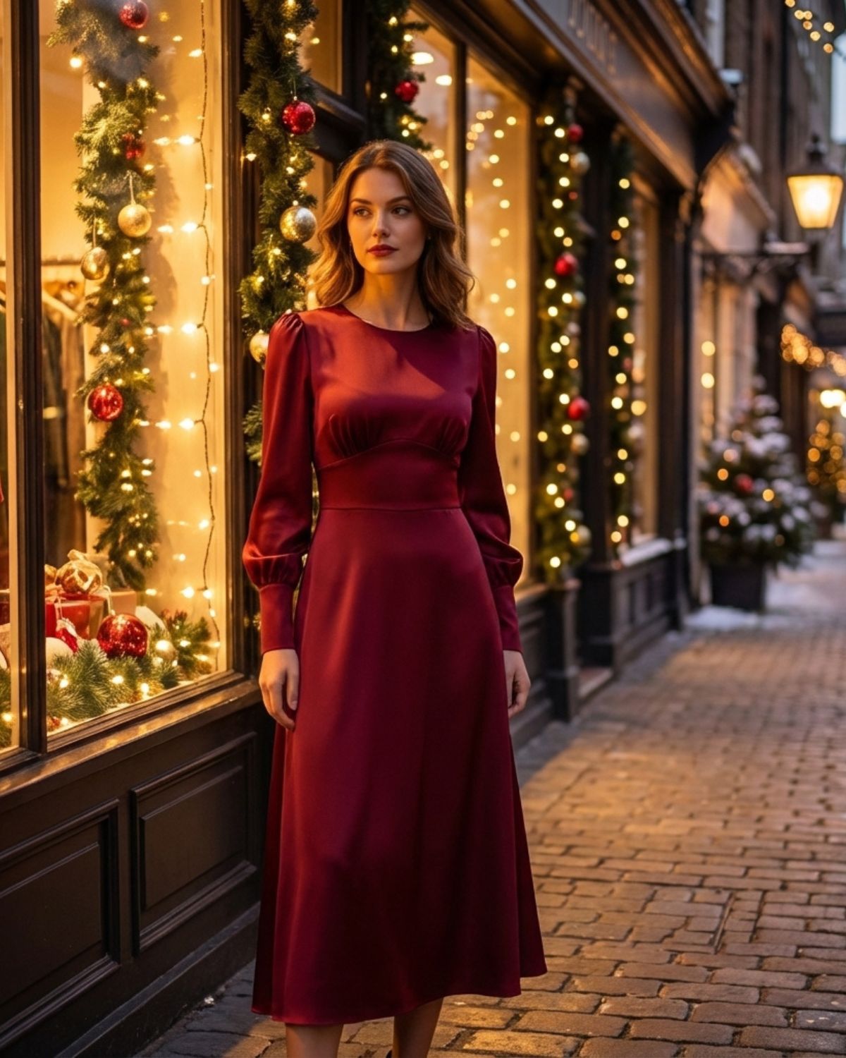 The wine red satin is rich and luminous—exactly like the photos, no dull undertones! The contrasting ivory bell sleeves are the perfect pop of elegance, adding drama without overwhelming my petite frame. The A-line silhouette cinches gently at my waist and flares out, making my legs look longer, and the midi length hits right below my knees (ideal with block heels).